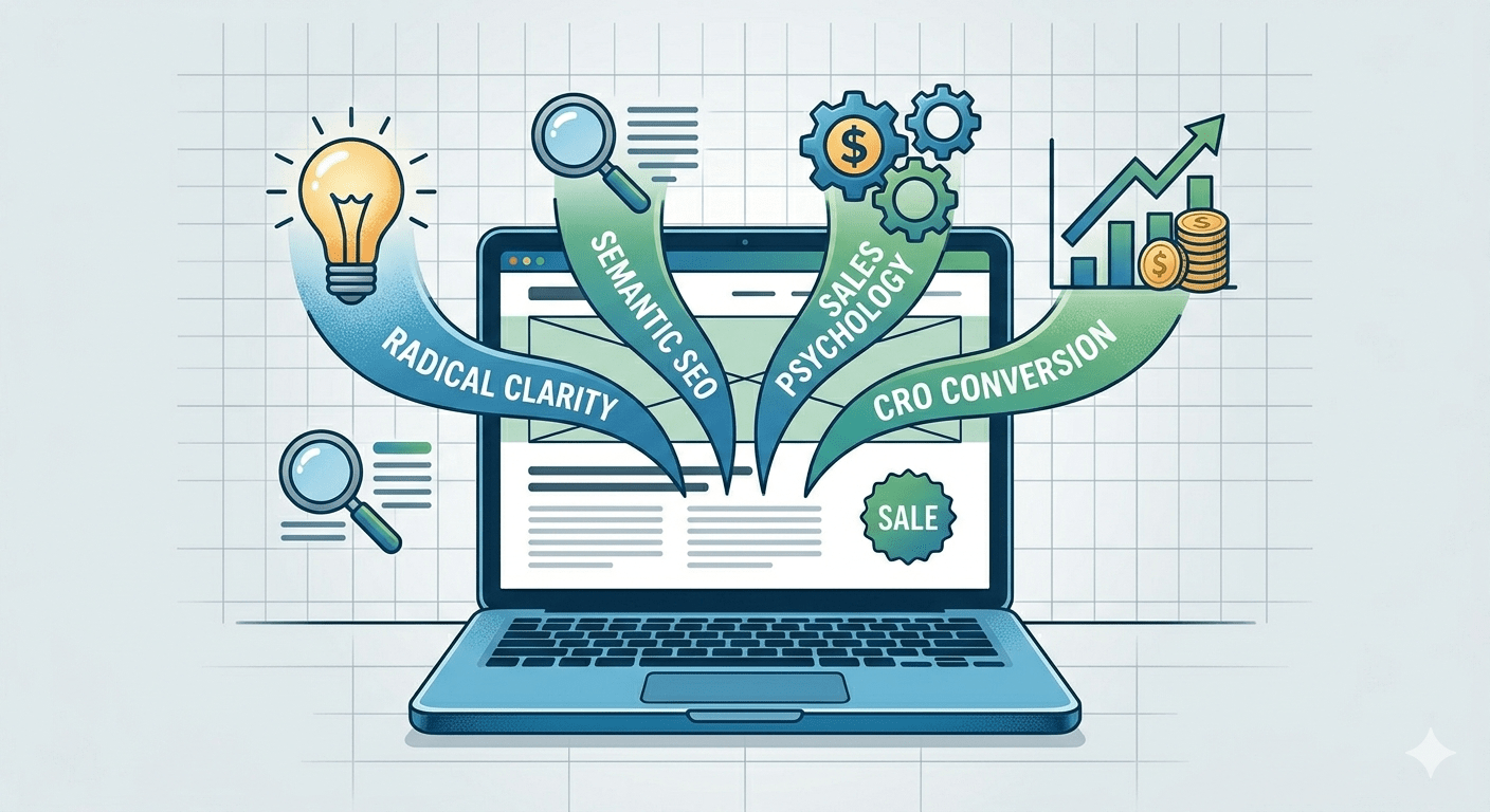 Muchos autónomos y gerentes de Pymes cometen el error de separar el diseño de la redacción. Yo trabajo de forma inversa: el mensaje dicta la estructura. No sirve de nada tener una web rápida (WPO) o un diseño responsive si, cuando el cliente llega, el mensaje es confuso o aburrido.